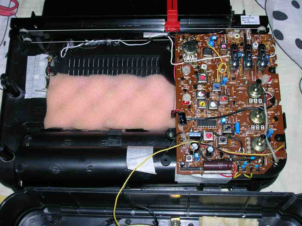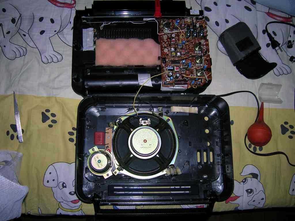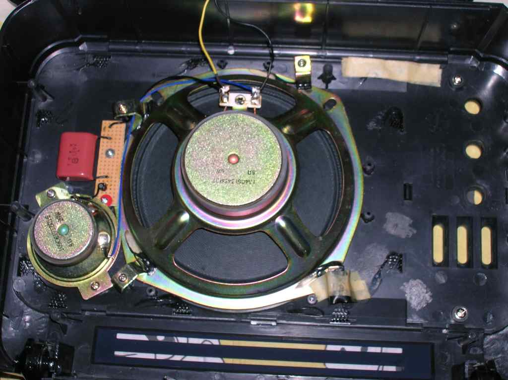 本来不想折腾保持原状,但突然发觉该机音质非常好,机机不可貌相,尽管这个机器看起来样子比较笨,但它有一个5寸的大纸盆低音还有一个2寸的纸盆高音,蓬蓬声不输于漫步者,喇叭音质秒杀手里所有机器,于是痛下杀手增加Aux,其中碰到不少难题,主要问题是这个机器的主板拆下来巨麻烦,得焊下所有的天线、磁棒线、飞线、电源线、变压器线、还得拆下调谐线盘,那个线盘是粘在调谐电位器轴上的,非常难拆,增加Aux倒是不难,不过我的目标是想让Aux输入后机器自身的音调、音量控制也能对Aux起作用,而且Aux的增益也要合适,另外就是尽量减少输入噪音和地线引入的50Hz工频噪音,折腾了几天,然后就是把机器原配的110V电源变压器更换成了220V的,原配的变压器是个小型的双9V变压器,采用半桥整流,可惜我找遍电子市场没买到双9V小便器,只买到了单9V的,幸亏机器的电路板上还保留了全桥整流的焊点,于是买来四个1N4007,把机器原来的两个1N4002全换掉,电源线也更换了,原配的电源线插头居然一个插片大一个插片小,普通的插座插不进去...另外的小修磨比如更换部分小滤波、耦合电容(我采用了全贴片件,在电路板反面看不到,嘿嘿)、把主滤波电容由1000uf换成了3300uF(减少嗡嗡),OTL输出电容从470uF换成了1300uF(增大蓬蓬),还更换了原机设计失误的一个滤波电解的接地点,此外还有一个小插曲是,该机的调谐电位器接触不良,导致调谐很难调准,并且这个电位器的外壳居然不翼而飞,于是我给电位器加上润滑脂后彻底 OK了,顺便拆了一个其它电位器的外壳给调谐电位器穿上了。