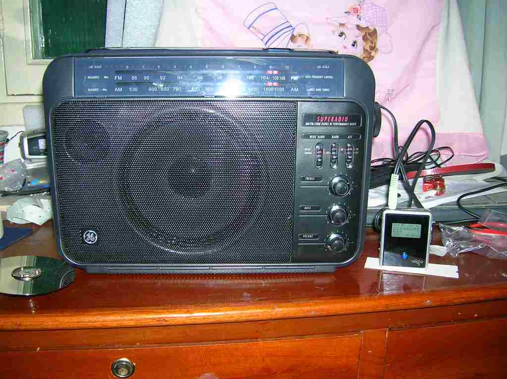 我加的Aux插口在机机的背面,这个位置是思考了很久才加的,因为这个插座原来的位置,机壳的反面,有个预留的AC插座的框,但厂家取消了AC插座的设计,框还在,于是插座正好装到那个框子里,增加的Aux插口,当插入音频线后,收音机的收音音频自动会被断开:
