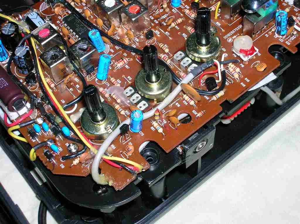 机机的主电路板特写:该机虽然只有MF AM两波段,却动用了12个中周,四个变容管,FM高放是周知的TA7358,中低放是比较少见的TDA1083,这个IC居然还是德律风根 (Telefuken)牌子的,这么小的一个DIP16的IC,在9V电压下,竟然能推得5寸大喇叭蓬蓬的响,还不过载,发热也不大,它本身还集成了中放,这个机机的音量电位器还是四条腿的,带有等响度控制,小音量下也能听到蓬蓬声,这也是我决心要给他增加Aux MP3输入的原因,图中那根很粗的灰色屏蔽线就是我增加的Aux输入线,通往机器背面的Aux插座,这根线真不好找,翻遍了家里的杂物,最终找出一根很古老的光驱到电脑主板的CD音频线,真是绝配!: