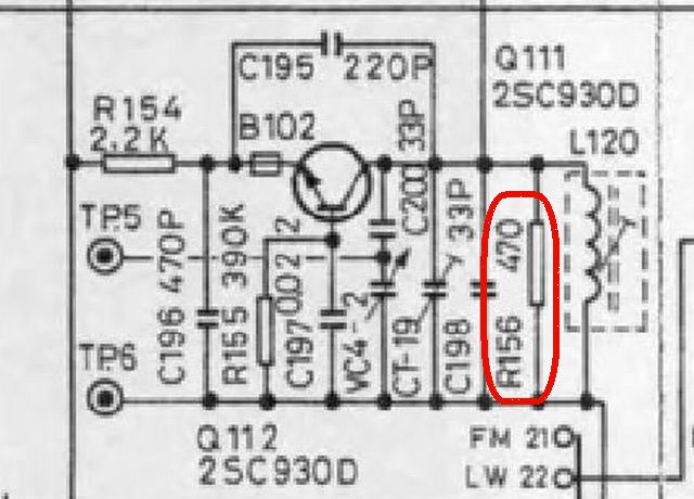 但转AM就很嘛嘛了,本地中波强台S表抬头都如60岁老头要XOXO启动般困难。短波无任何信号,先处理短波问题。居然中波还能接收,说明二次变频后的中放通道基本ok的,开信号发生器出10.7MHz第一中频工作频率,探在CF102陶瓷滤波器输出端就无信号?再出示波器探第二中频震荡,无!ok 看来短波无信号原因是这电路不工作,万能表量Q112震荡管子个工作电压也基本ok,再细细观察图纸,掂量是否年头过长电路基板或那里Q值过低引起吗?顺手将L102为减低Q值的电阻剪开。ok!短波即来信号。、