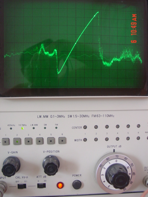 相位鉴频器虽然不具有限幅能力,但是由于它拥有更好的性能指标,所以广为高档接收机使用,而这种鉴频器的设计和计算完全可以参考这篇《比例鉴频器的原理与设计》。我用扫频仪扫过一个调谐器的调频电路,从图中可以看得出它那足够宽的带宽和良好的线性,我研究过它的鉴频电路正是使用的这种相位鉴频器。