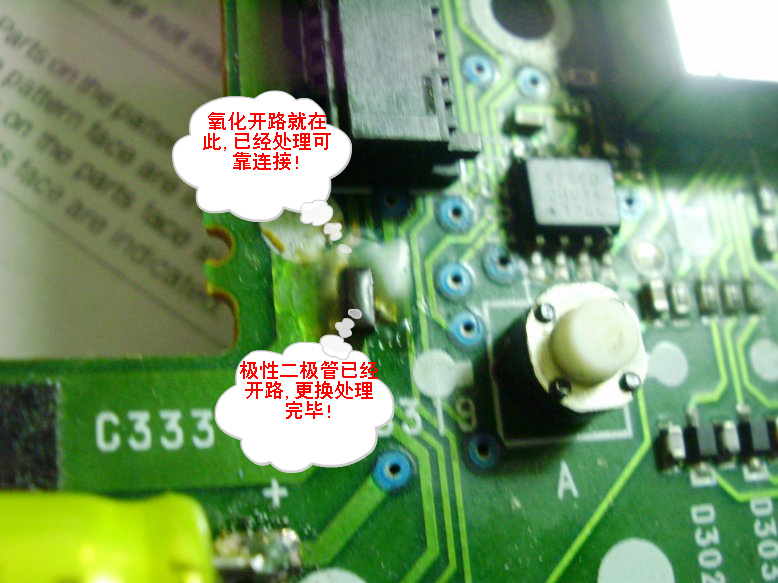 拿到鸡鸡我先通上电源看看症状,试机没任何反应,理论上来说通上电源显示屏上总的显示时间闪烁,看看线路板有酒精洗过澡的痕迹,还好上家没对电路做过手术,接下来就查线路图纸找到处理器部分的电原理图,分析原理图来看处理器默认为上电即工作,然后才启动主电源整机工作,接下来查处理器的共电,结果没有,首要问题是要解决处理器能动起来,仔细排查供电线路,结果发现有一只二极管开路,但是将二极管更换后上电,奇怪还是没有电过来,于是将对地检测换上二极管电极没有电压,我不的不刮开铜泊上的绝缘漆测量,哈哈,发现新大陆了,在二极管正极不远处有一小段铜箔已经氧化开路,呵呵,将其处理完成,连接可靠,上电试机, 这下有反应了,也能开机了,还有一个问题,部分字符数字显示不完整,但是能看到暗淡的显示,分析下应该是接触不好,将显示屏拆下来给连接的地方用无水酒精仔细洗了个澡,装上显示屏,固定好,通电!试机,一切OK!!! 以下是维修时记录下来的图片,及试听视频!