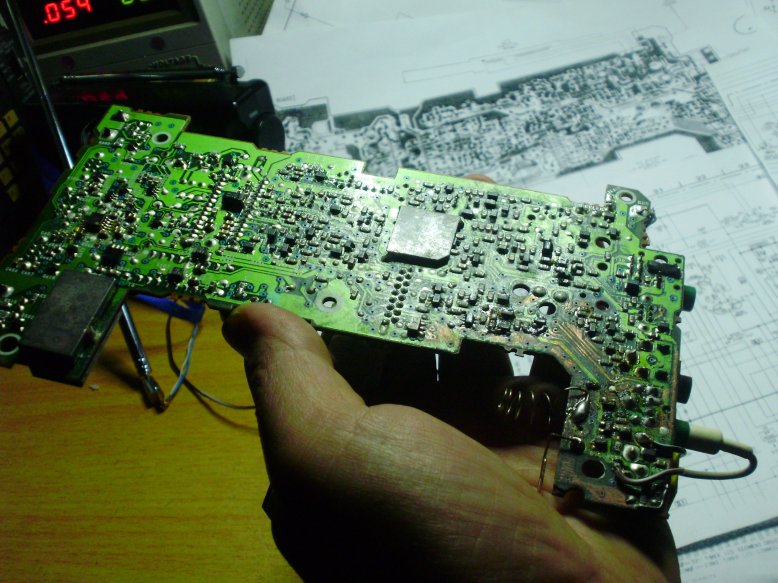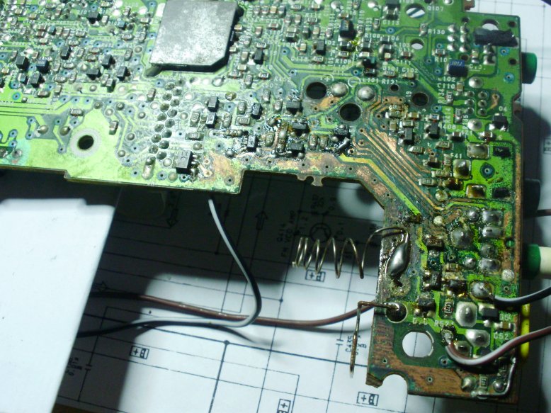 拉开天线,FM接收灵敏度超强,AM(530-1700)也完全正常,然而调到2M频率以上直到29.9MHZ 频段没任何反映,别说收到台了,原先不知道鸡主曾经送修过,接下来我仔细检查每一只可能调节的元件,结果发现在AM,SW,混频器有一只中周异常,磁冒被调节过,而且已经调到底,我找到一块7600G 的废板子做参考,仔细调节,使两只中周的磁冒位置接近,直到最后短波能收到台,通过我的根德鸡做基准,将鸡鸡的短波效果调到最佳,