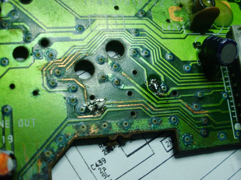 试鸡,还是开机不可靠,有是开不起,然后测量各关键点的电压,发现给显示键盘板的6V 供电不稳定,只有3V 顺藤摸瓜,结果在线路板的一过孔发现了破绽,一一处理完腐蚀部分的每一个怀疑的过孔之后,再次通电,