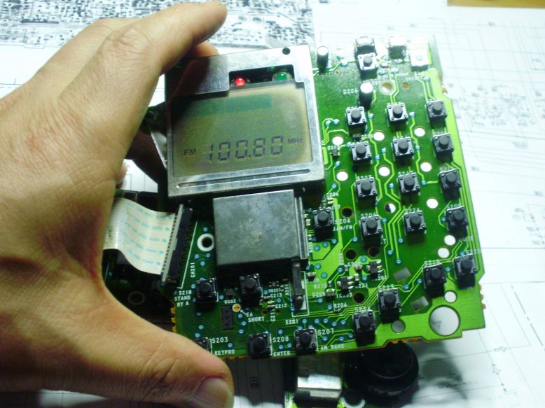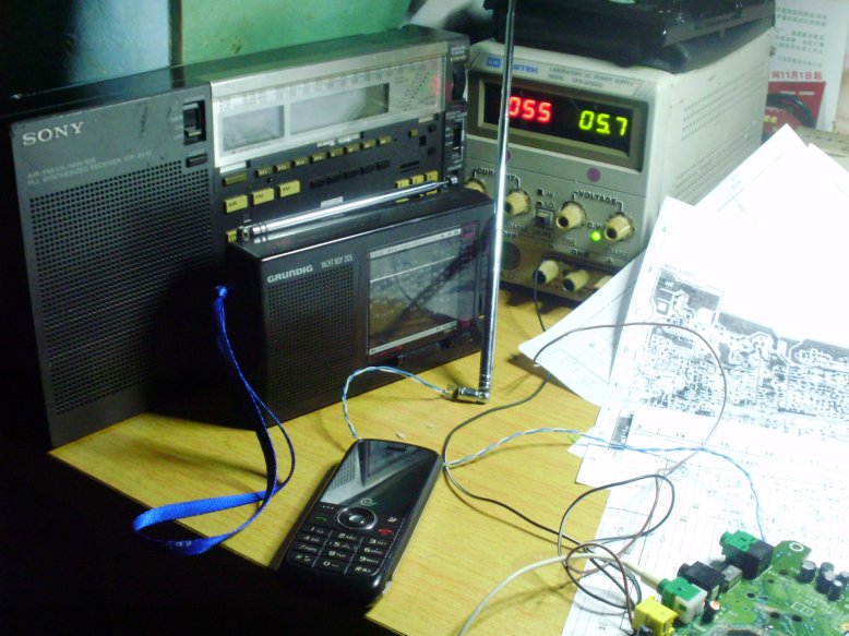 机器能可靠开关鸡,插上耳机,有正常的沙沙声,调到FM设定一个本地台频率,OK!出声了,而且不用天线信号也很强,立体声也出来了,