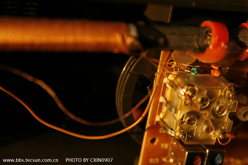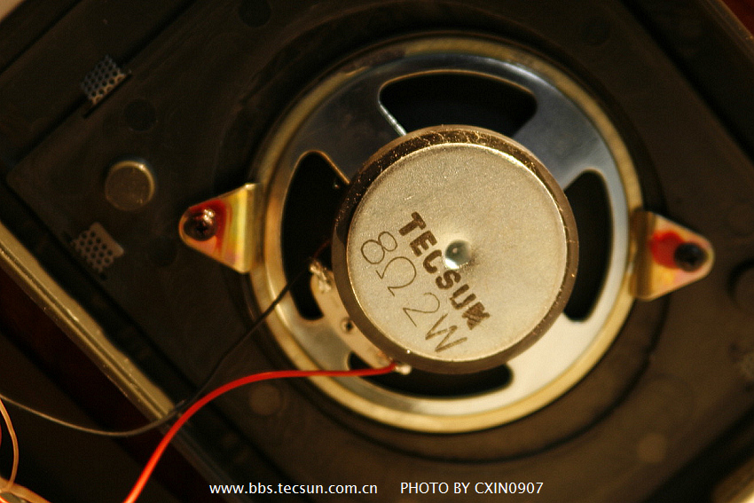 可以看到整體線路簡單高效,選料中規中矩壽命不錯。電位器差,開關波段結合差。喇叭就是3寸左右,也有兩瓦特承受功率。但是這絲毫不讓MS200有漂亮的聲音,只是比較洪亮。上面印字為TECSUN,難道,TECSUN也做小型電動揚聲器?