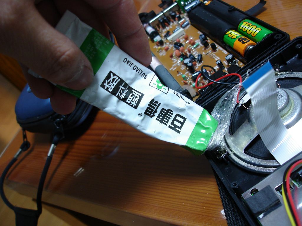 检查下固定扬声器的螺丝钉,生怕以后螺丝松动,于是就上了点塑料胶固定下,百事得塑料胶特点是凝结后具有弹性,是较好的固定材料粘接剂。