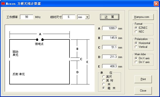 这个是moxon天线(有人说叫摩斯安,我感觉就是变形的八木)。这个天线的优点和上面的一样,是不需要调试的,连调谐也不用。网上有这个天线的尺寸计算软件,俺的计算结果如下图所示:
