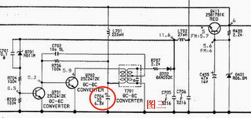 这明显是C704(22U)电解不良引起,震荡能量输不过次级了。将这电解(见图三红圈)换之。Ok!Q512管子源极即来12V。FM信号响了!这时候,这声音,如您在操作就会深刻明白啥被称之为天籁之音!