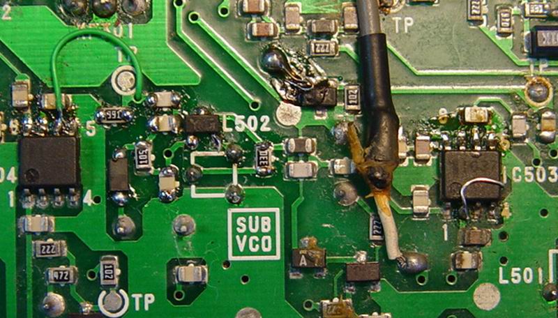 在AM状态打入本地电台1080KHz频率,只得杂音一片,无信号过来。探Q512的G极端电压,在0.8V(正常2.1V)。并分别打入29.99MHz与150KHz频率都是这电压,说明是DLL锁相环电路无进入闭环状态。探IC503(8)脚无震荡信号,往前查Q510漏极有啊!仔细查处印制板与C519电容间断裂,连之,IC503(8)脚信号ok。但AM1080KHz信号还渺无音讯。再探IC501(11)脚 AM DLL注入端,无信号,再又查处与Q507管子印制板穿孔连线断。这IC501(11)脚信号也ok了。但1080KHz信号还是只得杂音。奇怪啊!全电路已ok了啊。再查回IC503(8)脚,怎又没得信号了?在查找电路过程,示波器表笔刚触探到Q510管子G端,本地1080电台信号来了!并几乎每回开机都要触碰这地方才会工作,属本震工作处于起震的临界状态,需外部触碰下才能工作。啥原因呢?看到这高频震荡电路板有电解液污染情况,分析应该是这里电路板绝缘不良,使得整体电路Q值降低,震荡难以起震。沿顺已处理高频电路工作分配IC漏电手法,将这部位电路作清洁处理后。再开关机器再无不工作现象。AM/FM开机与频率转换都信号稳定。
