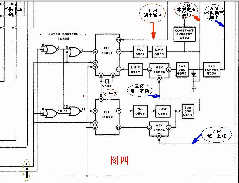 第二天,接着就是处理AM接收问题。这里觉得有必要先啰嗦下这类DLL锁相电路FM与AM本震工作之区别事情。潭里许多不大明了数调机器电路的朋友,会不会以传统思维曲解认为FM都ok了,AM就会好处理些。呵呵。。。。其实在这里是相反的。(见图四)这FM本震工作时,就只需IC501单枚DLL锁相环IC参与。DLL基频由自身4,5脚带X501提供,7脚输出推变容管控制电压,FM本震频率DLL锁相环回馈注入IC501(10)脚,改变FM本震时CPU数据写人这IC501单枚IC即可。而AM通道工作时,就复杂多了,先由IC502另外枚DLL芯片与IC504组成的电路,提供AM本震处理锁相环的基准频率。AM锁相环回馈注入还经IC503差分后,才引入IC501的13脚,要改变AM本震频率,数据不单单要写入IC501,还必需写入IC502确定基频。这是为何?一说大家就应该明白,如FM接收频率就是延展到76-108MHz,最高频率与最低频率相差也不到1倍,而AM要接收150KHz-30MHz侧要高达200倍之多,单枚DLL在同一基频,只是控制变容二极管的电压是覆盖不了的。早期的这类处理手法是与不同本震电感相切换来解决,如根德S300,S600等型号。在这款机器是通过变更DLL基频,来解决这频率大覆盖问题。说远了。。。。 这也就是xyz^-^那收音机三个世界划分理论里,所描述那款机器是否能走人第一世界阵营的基本要数,冠称之为双核系统。所以DLL处理AM本震问题比FM本震电路上,单单IC就多出三枚。