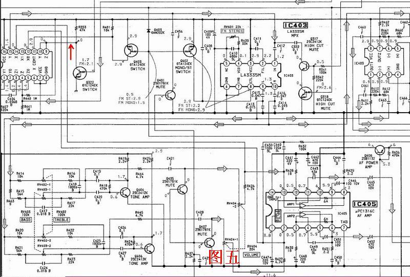 老老实实执行常规步骤,开音频信号发生器,出200Hz音频,从IC405功放开始逐级往前查找,一直上溯倒IC403 FM解码输出端都还是正常。改用镊子再往前探触碰查找,在IC402模拟开关的出入引脚(15,2)发现问题,(见图5)出脚(15)比入脚(2)衰耗许多!用万能表笔触控制10脚检查时,感应信号极为强烈,仔细查这连线走向,哦,这IC底板1连线通孔被电解液腐蚀断了,使得模拟开关IC402(10)脚控制端腾空(见图五箭头所指)。这COMS器件控制端腾空呈现在高阻状态,所以稍有感应就反应强烈。懒得再拆焊这IC402了,外部补焊条航空线。整机状态如新!再连续工作48小时,ok,送还物权人。