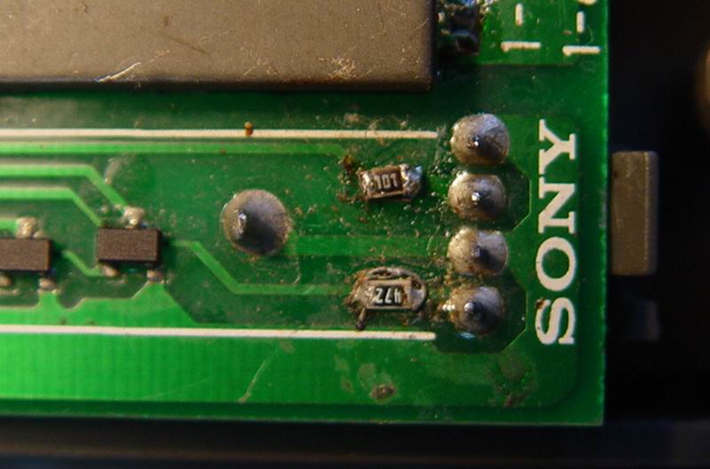 开箱打开机器,机器已无了电池盖板与后撑支架,前后固定螺丝也非原配。通电主板能显示,打入FM与AM频率无任何反应。打开机壳,见到接收板简直是一塌糊涂,特别是接收板的元件面,被电解液腐蚀的狼藉一片。IC501-IC504四枚与IC402被补焊过,那手法是极臭!看了就觉得呕心,这手艺怎能用到如人面桃花般娇嫩的17岁少女这里!几枚IC焊得真如是幼儿园小朋友干的,小学生应该都比这活做的好。即与机主联系通报一番,本想要机主能说要难为算了之类我好脱身,送回不想太麻烦。但反而听说了这台机器被辗转过全国各地,并在SONY维修中心被判了死刑的故事。倒想挑战一下看看她到底是犯了那天条,获得如此重判。