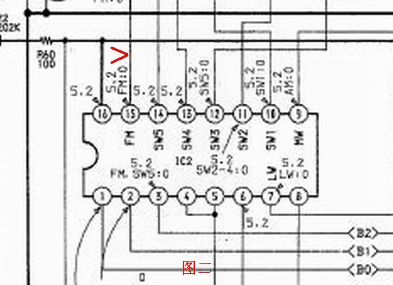 来了信号,FM转其它频率,或开关机的操作。是时好时不好不大稳定。探高放电路工作控制切换分配IC2(15)输出端(见图二箭头所指),发现FM不工作是电压切换开关引起的,好的时候IC2(15)端是0V,不好的时候是5.2V。这FM工作电源切换开关管是由IC3锁存器与IC2译码器2枚IC构成。查与CPU电路板连接的各条信号线都连接完好,见到这相关电路板都有被电解液腐蚀情况,再分析电路觉得会不会也是电路板绝缘不良的原因引起,特别是ALT这条数据线,这信号所需的2枚IC输入端都串有10K的电阻。拆下IC2/3,将底板认真彻底清洁后焊回IC2/3,FM再开关机与转换其它频率,每每都干脆利落了!证明判断处理正确。呵呵。。看官们看的时间是觉得蛮快。要知道我处理完这些问题,时间已是晚上0点。