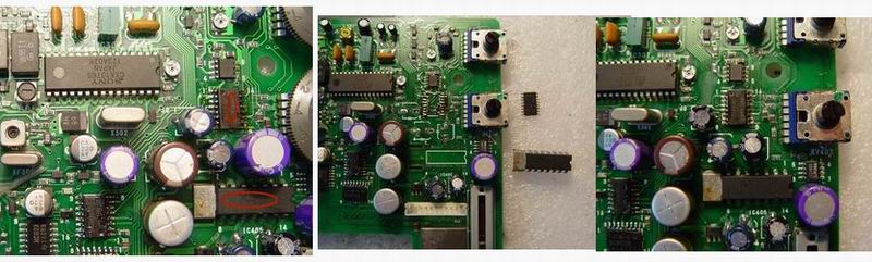 看来这毛病如是个老故障了,被上家出了这手法来减低这现象。将这短路导线出除后,感应现象在电位器最低端变得也非常强烈。按前这机器打理过程而来的习惯性思维,未按电路逐级查找,想必然这情况也是电路板漏电而引起。将IC402与功放IC405,和已焊上的新电解全一并卸出,底板作清洁处理。器件焊回后,通电感应现象稍好了些,但未彻底消除。仔细与正常SONY 77对比,所发出的声音没正常那么大,低频蓬蓬声成分也少了不少,纳闷?