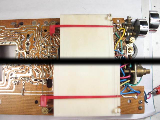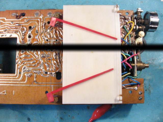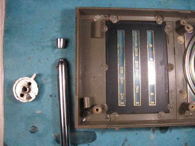 接着用A,B胶粘回断掉的底板固定柱三根,一根掉出,一根还被螺丝紧在底板,还一根连影子都没了,扳下一旧机柱子接上。五根底板固定柱全了。粘回波段开关扳手旋钮。再找出上次改139A军机中波做拉杆天线卡头剩下的边角料,做了个天线底板托片,效果还较得意。最后将天线头用1.5mm钻头打一小孔,用焊枪焊回。拉杆天线外表也看不出啥不原装。昨晚将完美的底板放入机框,螺丝装上,再经墨黑MSW-7625作全面统调。一切ok!弄到时间是昨晚下半夜3点。