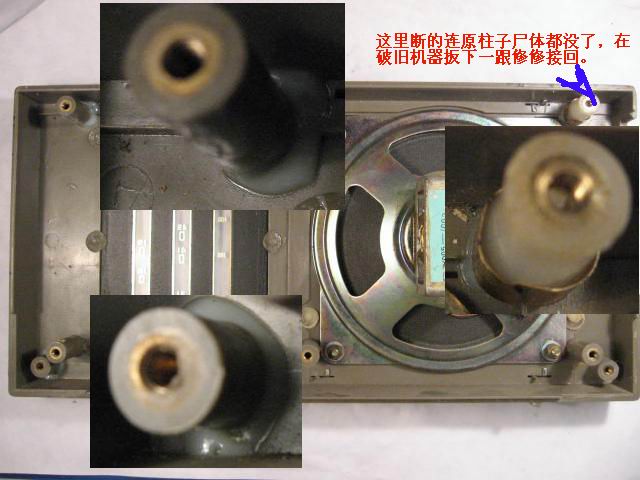 机器到手知道要打理,心中按JS所述故障没当回事,想当晚就摆弄好她。打开机器后盖就掉出底板固定柱一根,再仔细一查,嗨!严重多了,花了二晚的时间检查,先后发现下列问题: