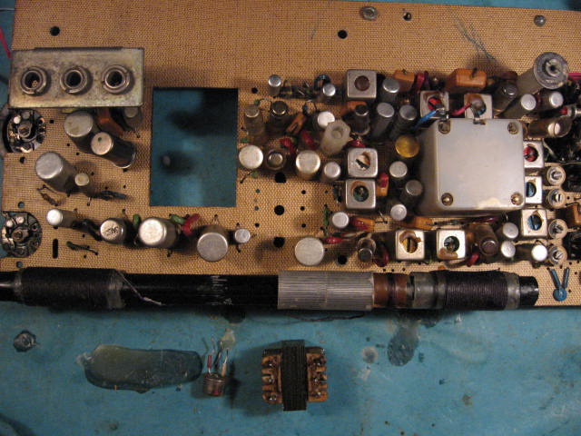 在机器到手的当晚先通电,量OTL输出电路中点是近6V,查出下拉功放管3AX85 C,E短路,手头没这型号,换上相似指标的3AX83二只,中点还不正常,查下拉管B端没偏置电压,再查输入牛次级断,拆出检查还发现初级也断了。想拆出铁芯重绕回,一想要绕的话还不如拿我珍藏多年的程控交换机线路隔离牛来用用?此时不用待何时啊?翻箱倒柜找出几只来,是玻莫合金片,漂亮!当晚绕好(初级2000圈;次级1000+1000圈,都是0.08mm漆包线)已是下半夜二点。第二天晚上将绕好输入牛装回,声音来了,但灵敏度极差,只有本地电台一个。查到高放级发现问题,是上家那位臭手在拆出高放管后焊回时尽焊错地方!插入时将三只脚插错位了,基级没焊在偏置的地方,错焊在E级,而将管的E级焊在C级,管的C级焊在中放线圈的热端了。这样高放级不单没放大作用,还衰耗接收信号。将错焊的管子拆下量了一下,穿透电流较大,另焊上只质量很好的4腿3AG28,OK!信号正常了。毕竟是带高放的,灵敏度感觉特正常。再摆弄那松动地音量电位器,电器结构没啥问题,音量控制都正常,就是中间主轴太松动了,装上拨盘旋钮晃来晃去的,一开机就要拨它,第一就有这机器不牢固的感觉,看电路图那音调电位器也4.7K,平时少动它,将它二换换不就ok?还保留原装元器件,再拆换过程留意看了一下,啊!没戏,一只是A型的,一只是X型的。老老实实找出只新的4.7K电位器换下那中间松动的。原想要全面查查各极管子的偏流,量总电流在无信号时是16mA左右,觉得挺正常的,加上还没作统调灵敏度都不错,就懒汉了一下,没再理它这问题了。
