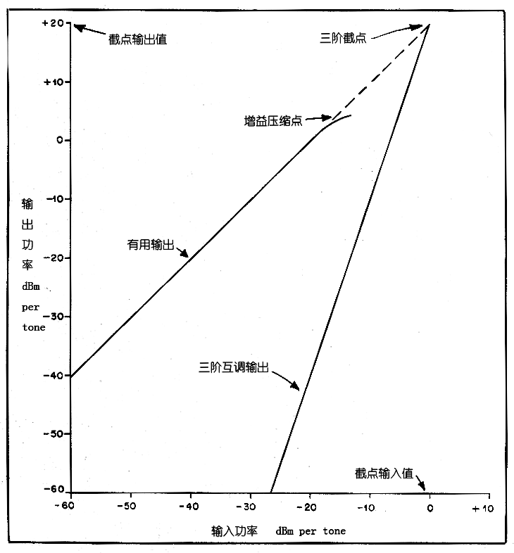 了知自己的放大器或收音机的三阶互调截点位置是很有价值的,它能帮助我们更好地了解该放大器或收音机在整个复杂信号强度的范围内工作的好不好,失真情况如何。以图为例,截点的输出值为+20dBm,那么当有用输出信号比截点低XdB时,三阶互调失真产物就比截点低3XdB。例如该放大器正常工作在游泳输出为0dBm的状态(比截点低20dB),那么失真产物将是-40dBm(比截点下降3×20=60dB)。就好比失真降为1%了。