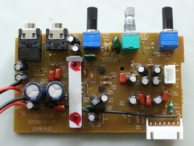 S2000推出后,看到网上有不少坛友都有着与我相同的梦想,有换喇叭的、有加“补品”元件的、有改动功放的、有改音调电路的。对于这些改进,开始我也是按照这个思路进行的,希望不要大动就能获得一个理想的结果。这样类似的改进工作,陆陆续续经历了大约三个月的时间,首先是换了不少喇叭,再是在原来功放电路基础上修改高低音提升电路,再就是改功放(换功率更大的IC),…。由于当时没有想到要把这个过程放上坛子,因此没有留下什么照片资料(以下称为第一阶段)。这一过程中我的结论是,在现在的这样的结构和设计思路下,S2000已经在电路、电声等方面做得很好了,基本没有什么改进余地了!试验中发现,这些改进往往是解决了一个方面问题,但是马上带来了其他方面的问题。发现这样问题后,我很快就放弃了这样的改进而换了思路(在此之后为第二阶段)。