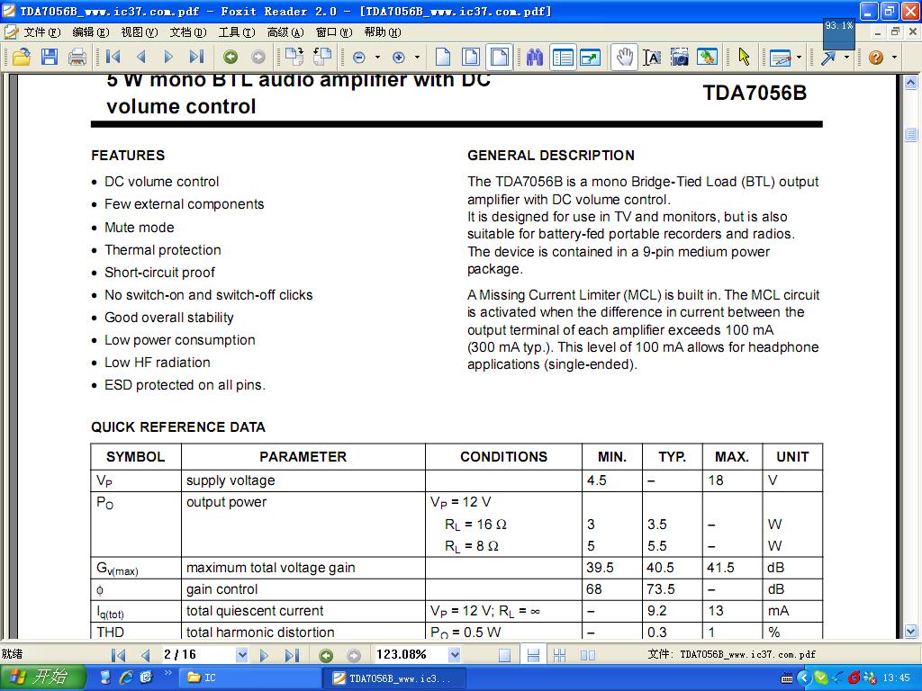 输出功率: 4.5W(在9V、4欧姆、BTL、THD=10% 时)