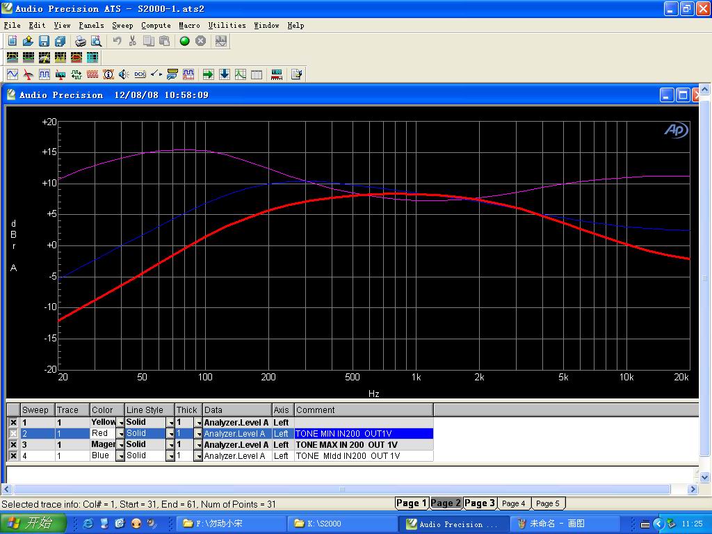 中间这条粉红曲线是S2000正常灵敏度(250mV)的曲线。从图中可以看出,音调提升和衰减作用明显了,但是输出功率小了,在主要频段上的平均功率约1.2W(最低只有500mW),相比于下图(S2000功放正常状态)其输出功率显得小了不少,因此不失真时的音量小了许多。另外,该电路没有把100Hz以下进行切除(以下SJ2038、TDA7056B等电路都有类似功用的设计),这部分无谓的耗电较大,同时有可能带来喇叭的大幅震动,带来失真。这个改进是以输出功率为代价换来音调提升的改善,这样的改进听感并未因此明显变好(虽然高低音调整变得明显,但是整机的响度明显不够了),也就是说当音调提升后,为保证不失真,其有效输出功率减小了。我也尝试过7.4V的供电电压,其结果仍是不太理想(但是有些改善,也许改为12V供电时会改善更多)。因此,我认为这个改善音调电路的方法虽然有可取的,但不是最理想的。