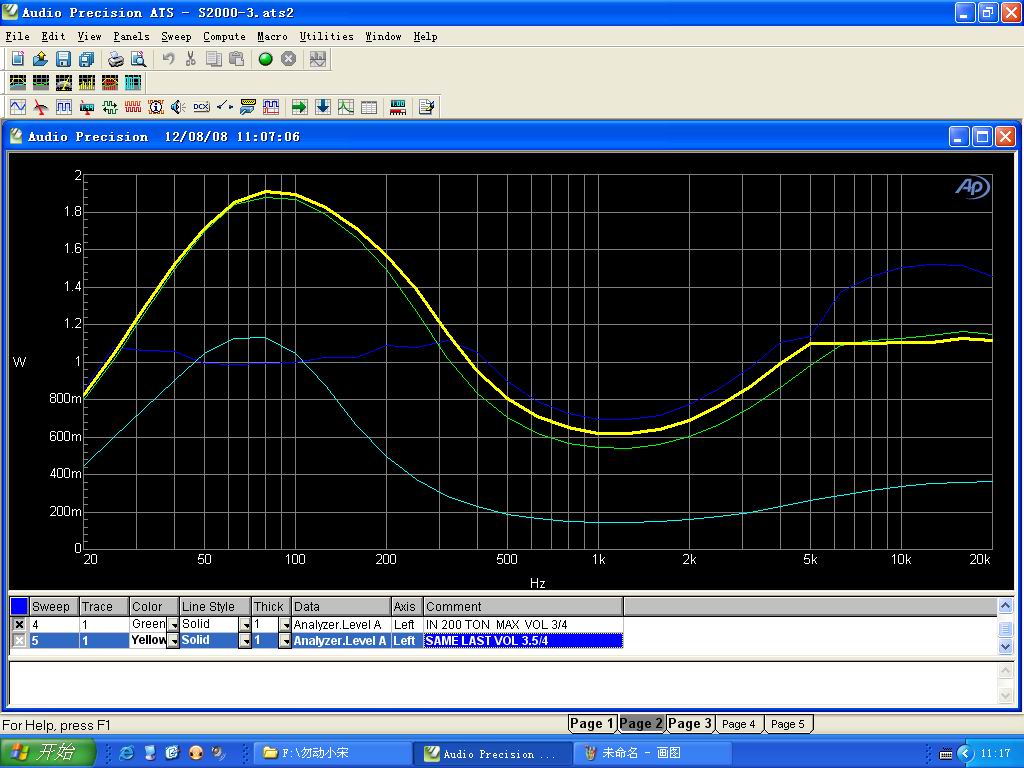 由此图可以看出S2000在有效频段内输出功率基本上都在1.7W以上(粉色曲线),虽然音调作用有限,但是保证了最基本的声压级,。(如果100Hz能进行切除处理,整机的失真和耗电都还会减小)