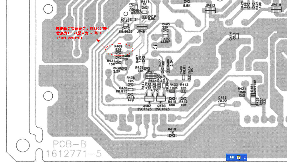 2、WR-1 DBB(动态重低音),如何降低? 加大DBB的阻抗, 经测试将WR-1 PCB-B 上R409位置的820欧的电阻更换到1.5K时候过强的低音减少了,再没有发闷的感觉. 当然,你也可以找个可变电阻来测试玩玩, 感觉一下那个阻值的效果最好! 不过我的推荐是1.5K。(更换电阻 CH RD 1/16W 1.5KJ-C)