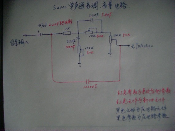 当第一次听S2000的声音时,就感觉特让人失望,也许是对S2000音质要求过高了吧,于是在29日晚19时开始对S2000的音调电路进行了彻底的改造,一直到第二天凌晨5时才睡的觉。改造后S2000其低音醇厚、高音透彻,比之前强很多,现将改造过程介绍给大家,望能起到抛砖引玉的作用,图片是自己用三星L730相机拍的,由于拍摄水平有限,故效果不好,电路图是自己手绘的,凑合着看吧。