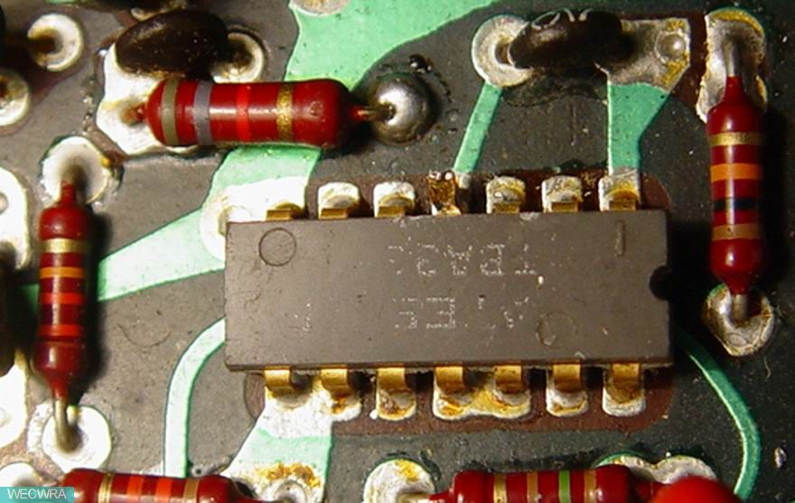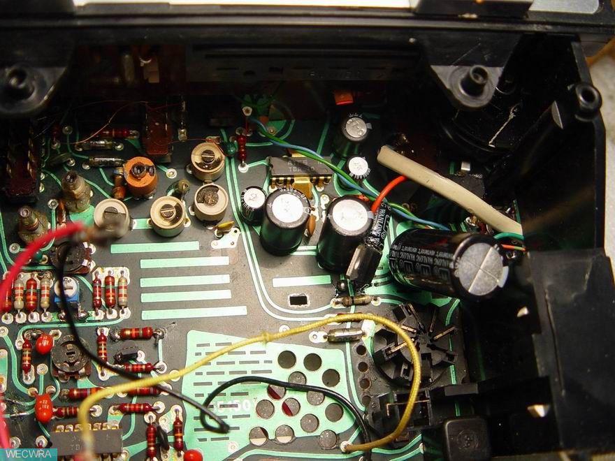 旋下3枚长长前后机壳穿心螺丝,提起机芯。目测就发现多了几枚元件与加有跳线,还换上了几枚鬼子电解。全面检查后,才知道这台机器又是台被上家臭手瞎整过的机器。(这位上家如能看到图片应该能知道我说的就是那台机器吧?想一般玩这东东的这广坛您也不会不来吧?)多加的几枚元件是代替7V稳压IC向前级电路供电的,但怎用了7809?使得AM通道前级放大过强到压抑状态,并且FM电调电压高了近30%,使得FM接收信号乱走。