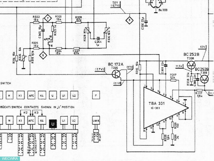 本想用317之类的可调稳压器件将前级供电做个7V电路方案。经再仔细分析这款机器的稳压电路。发现不是这么简单,这稳压IC除向FM前级供电外,还是FM高频头电调的供电电压,AFC控制打开时这端电压要随着FM本振偏移随之调整。再考虑这控制怎加上我那方案时候。原对这老TBA331集成电路能找到资料根本就无信心的我,随手在百度敲出查询,