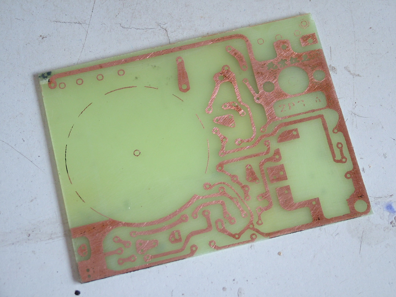 把画好的印刷板图反转180度后打印到热转印纸上,然后用热转印机印到敷铜板上(据说没有转印机用电熨斗也成),撕去转印纸,把敷铜板放三氯化铁液中腐蚀.