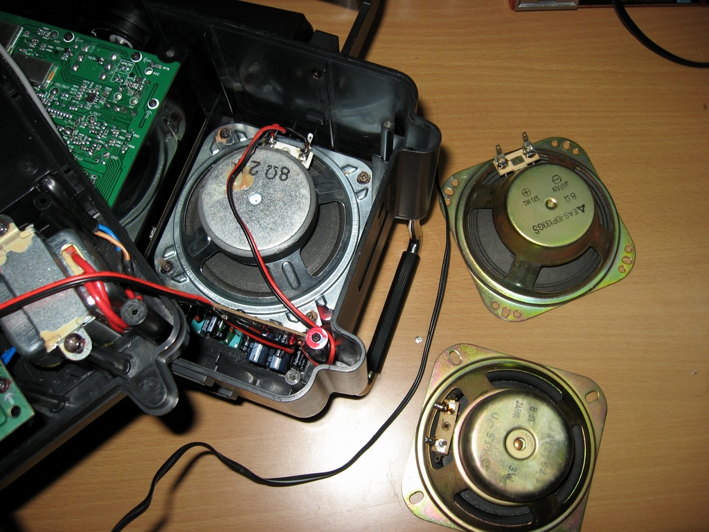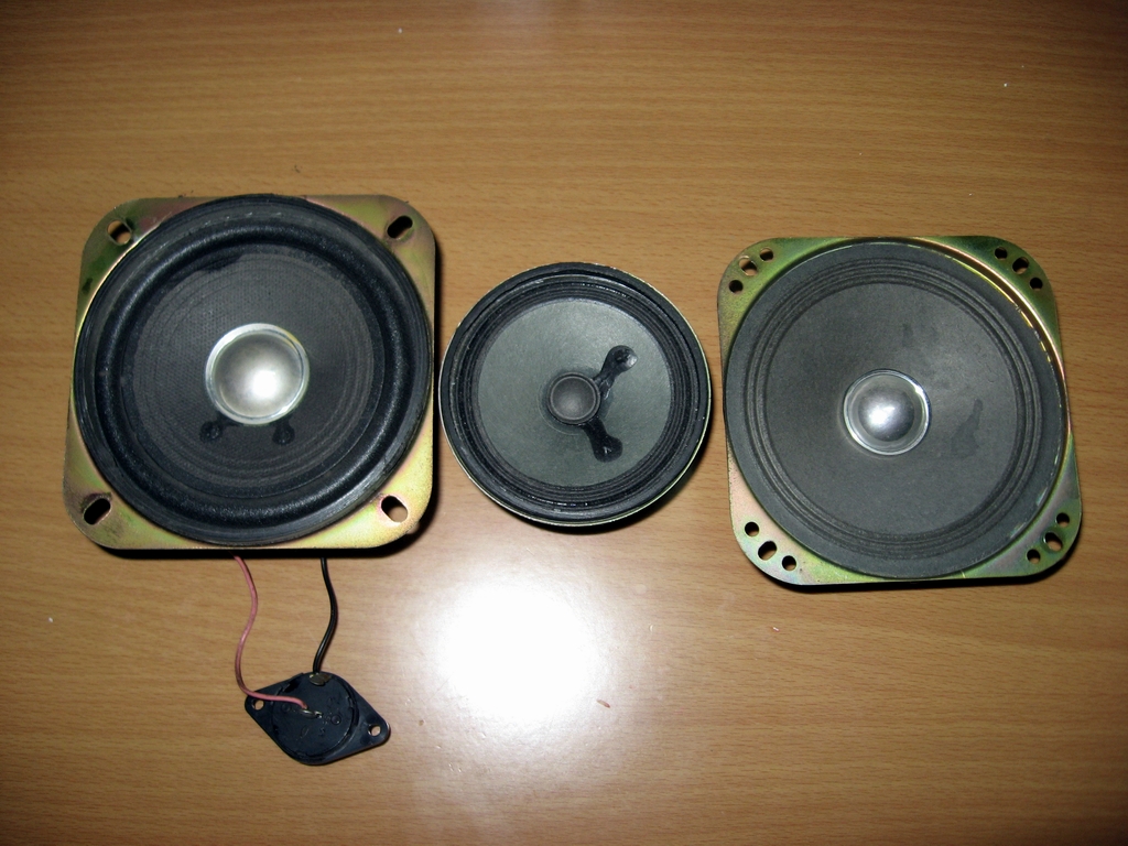 喇叭是从旧电视机上拆机的,日本喇叭,图中左边一个我不知是什么牌子的,上面标了“U-531”字样,象二战时德国潜艇的编号,4英寸,泡沫(橡皮)边全频扬声器,阻抗8欧姆,标称功率3瓦特;中间的是DED,阻抗16欧的,标称功率4瓦特,但尺寸比较小,只有3英寸;右边的是EAS,阻抗8欧姆,没标功率,4英寸。