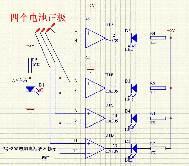 用了一个红色LED作为电压基准,大约1.7V左右。放入电池,电压低于1.7V是肯定的,比较器输出低电平,指示灯亮。
