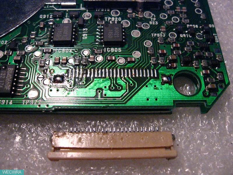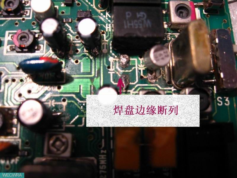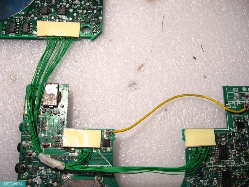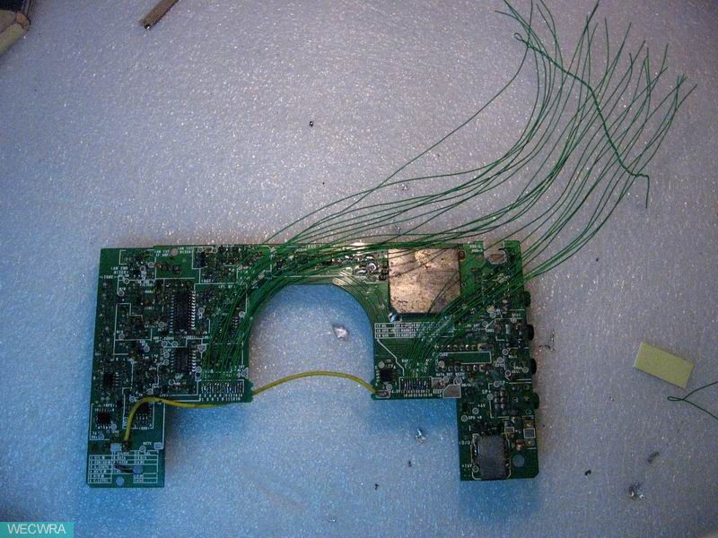 机器被上家,从打理手法看出肯定不只一家,上下电路板软线就连了多处,常规电解已换了一半左右,手法极臭!电路板元器件焊盘脱离也多处。俺打理接收信号板查出断裂问题10来处,天线信号输入方式开关小凸端也断裂。再将相关关键部位未换的几枚电解换好,接收板仔细检查后将这已经不能再将就的软连续全部清除,24根上下板用航空线一一焊回。