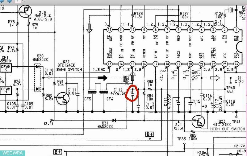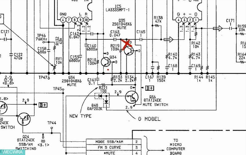 经示波器检查6脚的信号是个不稳的漂移信号?再上述运放输入,查到中放IC2(16)脚,信号漂移信号仍然还有,感觉问题应该出在C112的47U电解上,但因为手头只有电路图,无印制板位置资料,搬开二枚元件后才查出,离中放IC这器件很远的位置上,查出前几天未发现的这电解正端焊盘断裂。焊上后,3个问题好了2个半!还半个是静噪情况好了很多,但并没完全消除,在看电路图感觉应该不是这SIGNAL LEVEL信号问题了,因为搜索,信号强度指示功能都已正常。检查这MUTE (4)静噪在开机转换频率时信号是有来,顺着这信号查出Q35静噪开关管C级断开。焊上后全机工作正常!