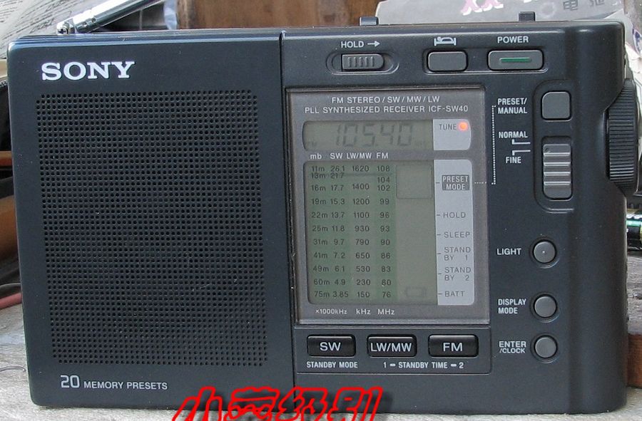 ICF-SW40是索尼公司在90年代中期开发出来一款调幅两次变频的调频调幅数调普及机,面板上的布局很特别在90年代,整个显示屏分为两个部分,上面是显示频率或者时钟的显示屏,下面的屏幕是模拟指针和功能显示区。
