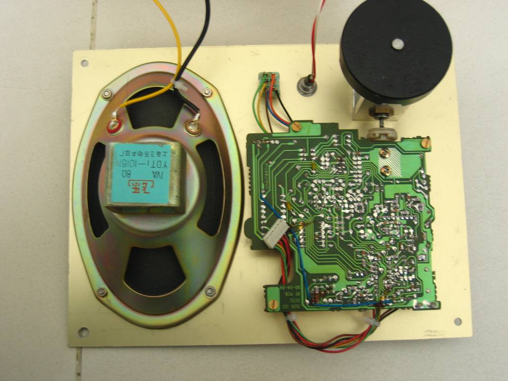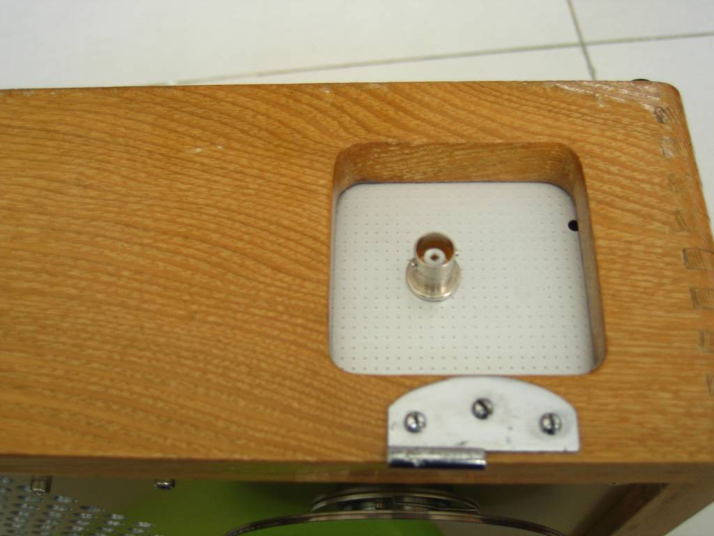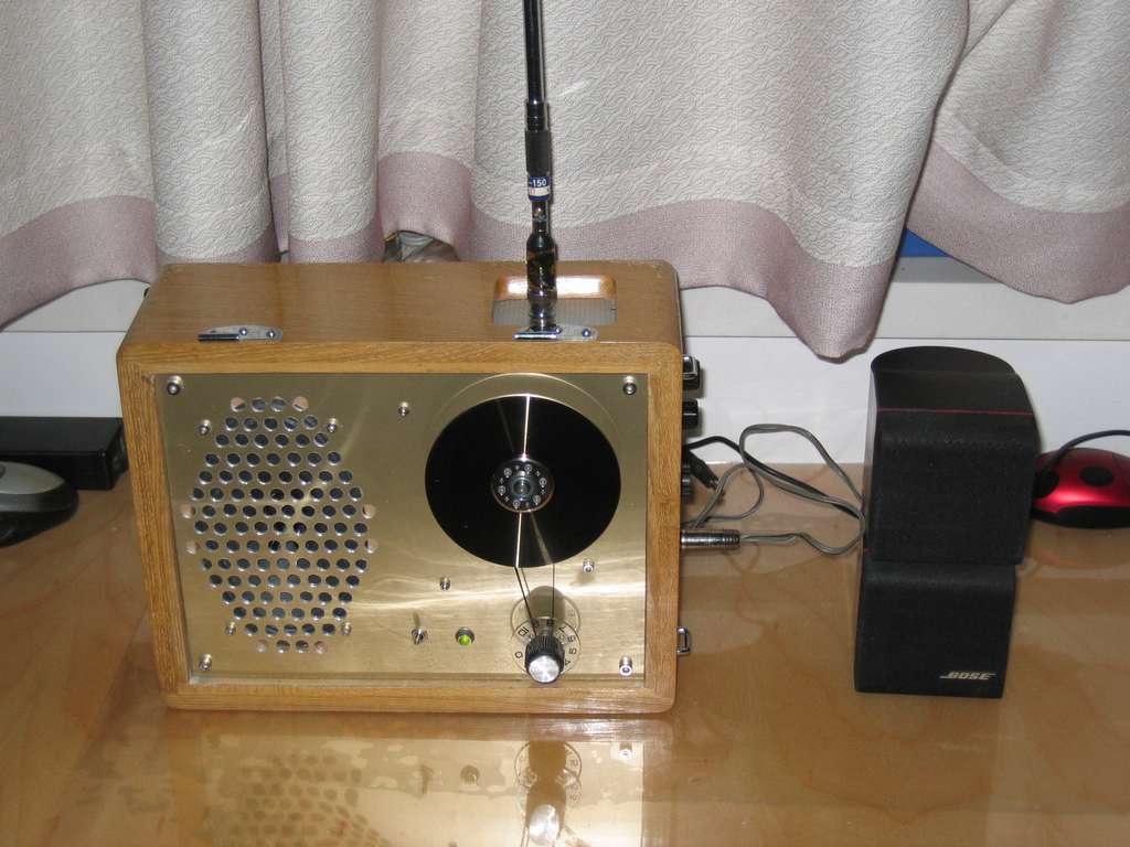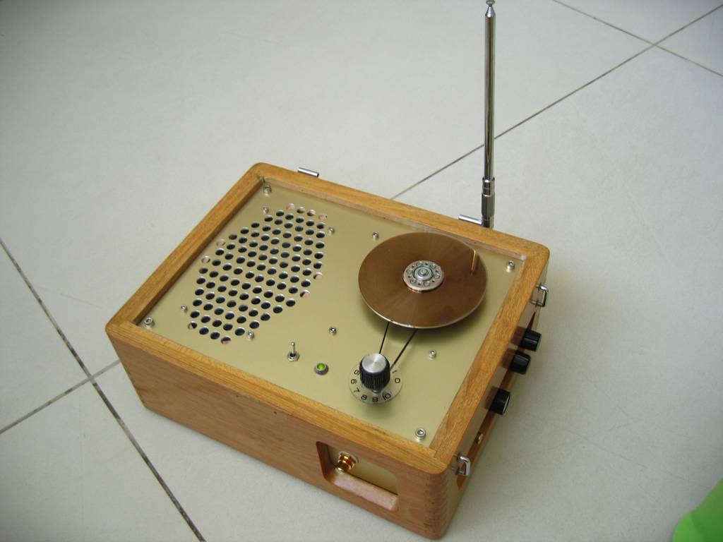 给木箱加工一块面板,这是俺的强项,有锯有锉就能搞定,把喇叭和高频部分电路版固定上去,那个纽子开关是转换波段的,AM-FM,发光管是立体声指示灯。