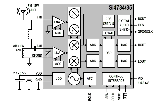 Si473x提供很好的调幅与调频电台搜寻与调整能力,可减少干扰和改善收音效果。它还拥有好的收音灵敏度和频道选择性,能够收到其它调幅/调频收音机无法搜索或正确辨识的许多电台。Si473x提供可调式软静音和其它音频加强功能。 Si4731也是唯一支持欧洲(RDS) 以及美国(RBDS) 标准的调幅/调频收音机芯片。这项功能可将电台和歌曲名称等信息显示在任何产品的LCD屏幕,提供给使用者类似便携式媒体播放机的视觉体验
