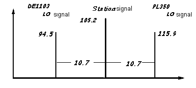 由于DE1103采用了低本振模式,所以在接收105.2MHz的枣庄交通文艺台时,本振频率是94.5MHz;PL350的本振频率则是115.9MHz。DE1103的本振信号94.5MHz与枣庄交通文艺台105.2MHz的信号频率在TA7358AP的RF放大或者混频器中都可能产生非线性差拍(或者就叫混频)生成新的频率——10.7MHz,而且堂而皇之进入下面的一切活动。这里要注意:DE1103的本振信号是个等幅波(CW)哟!