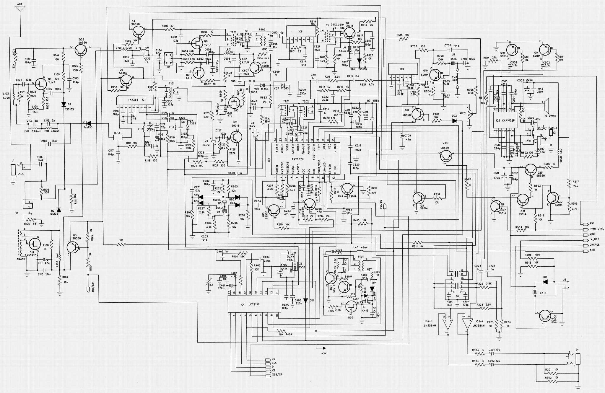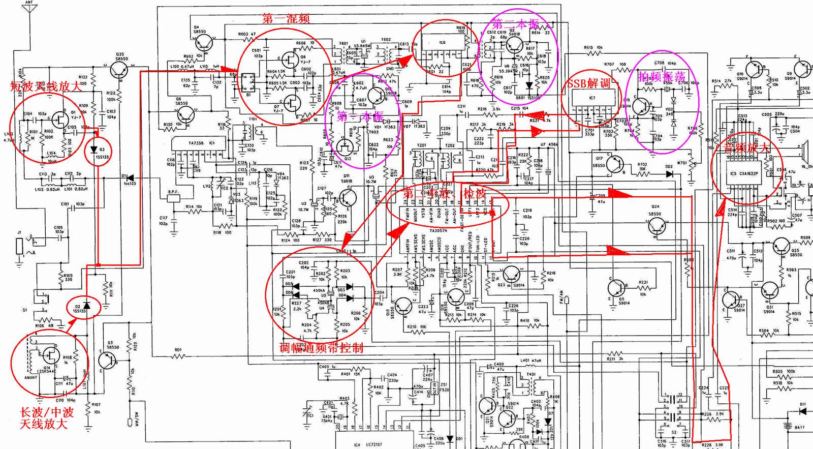 从这两张图看,调频在1103中属于一般的普通线路,而比较复杂的、也是1103比较突出的是它的调幅处理,以前,坛子上有人问过,1103调幅连续覆盖100KHz—30MHz是如何实现的,在没有看到线路以前,按照以前收音机设计的概念,这个问题确实是个问题!因为要覆盖100KHz—30MHz,在以前都要划分为好些波段去实现,这一划分,其中的滤波器、振荡线圈必定众多如麻,然后,拆开1103机盖却看不到这些东西,因此这常常困惑了许多的收音机爱好者!