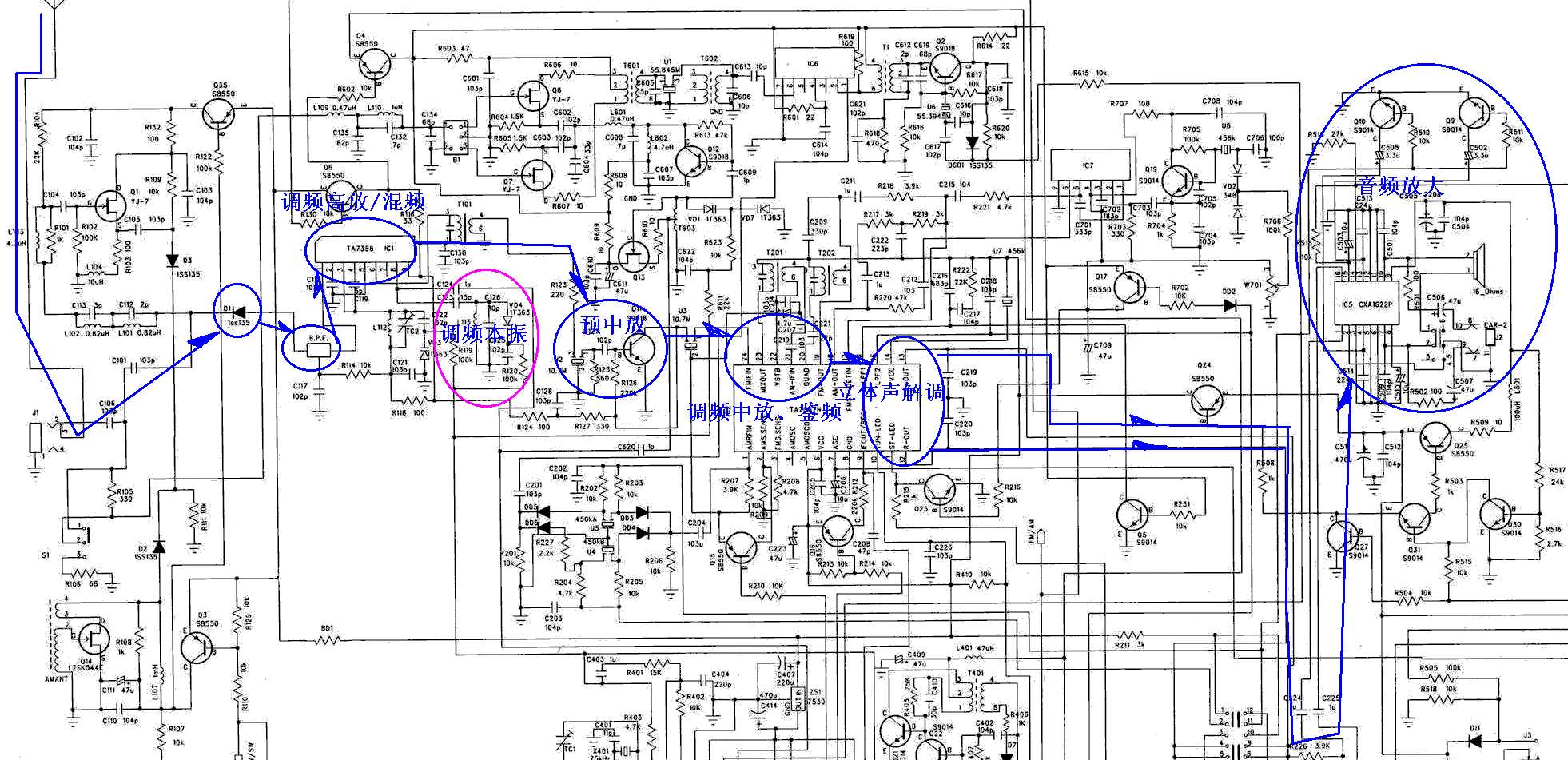 把调幅和调频通道信号走向画两张图比较明了...