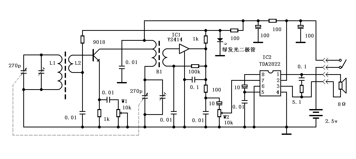 高放式收音机调整简单,适合业余制作。IC1是收音机专用放大集成电路,类似的型号还有BS414、IN414、MK484、NT484等。W1是手动高放增益控制,它能有效地控制高放级的增益。W2是音量控制。270p的双连可变电容构成双回路调谐,双回路调谐是为了提高选择性。