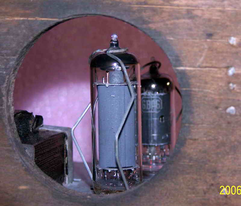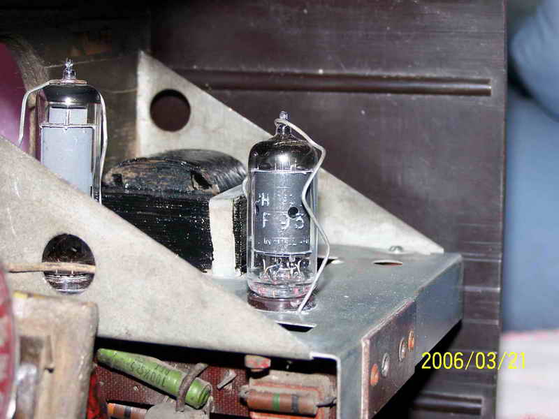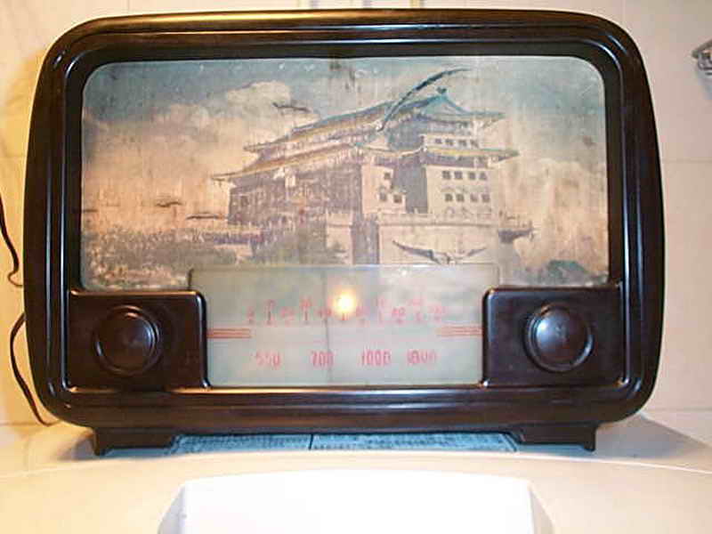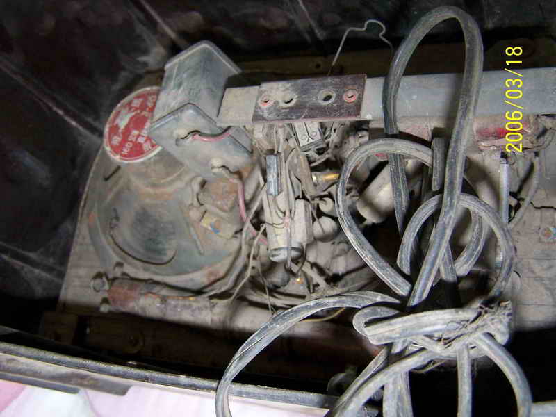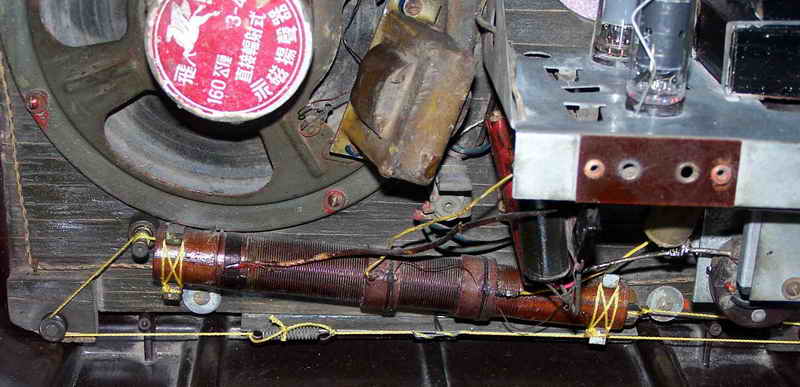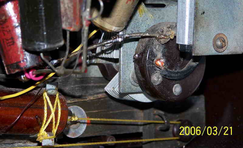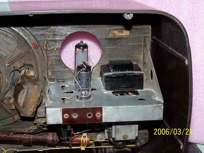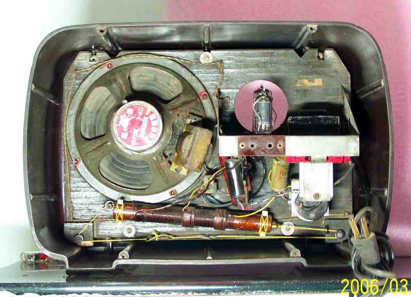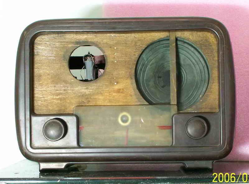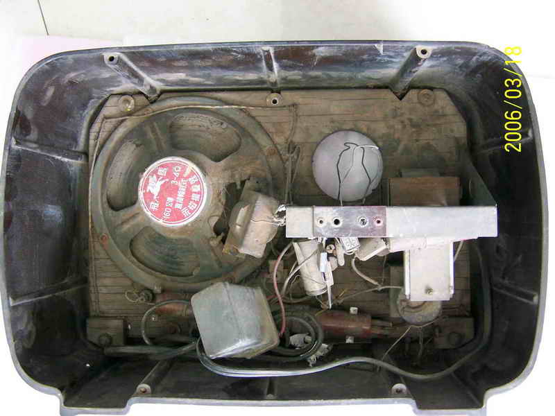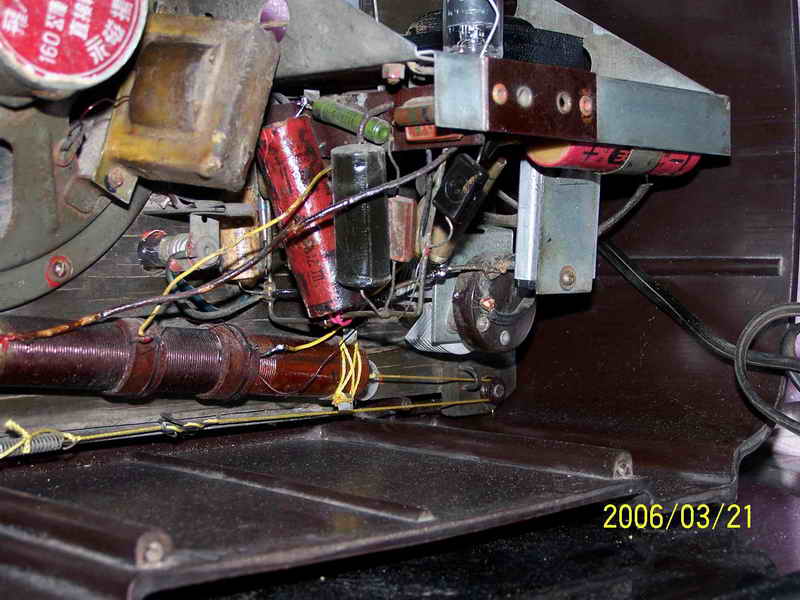 看见自己最心仪的机机被别人折磨成个这,我首先想到的是怎么把它尽可能地恢复。好在此机简单,加之曾经修过此机,如果变电源和输出变压器以及那个硒整流器没有坏,我这笨人也能应付。简单查查,谢天谢地,我最担心的三个零件全还健康,这我就放心了。原拟用刷子清理一下卫生,没有想到历经几十年的尘土全成精了,刷不下来,心一横,把上面的三个零件拆下来,用了坛内某大侠惯用“伎俩”(开玩笑,请别对号入座)-----水洗大法,哎,还真管用,洗干净了。是日惠风和畅,阳光充足,凉晒两日,干了。对照线路图,把三个元件全部归位,把上家换了的那个电容器也更换了老式电容(上图六输出变压器旁那个大家伙,明显不靠谱,真如一肿留),插头也没有了,还好手头有一个军机的电源线,换上,通电试机,无台有严重的交流声,心里高兴的那个劲简直无法用语言形容,无台不要紧,我等笨人最怕电脑无音。交流声严重,首先想到的是滤波电容,原机是两个8UF的天和电容并联当16UF用,焊下来一测试,近乎0,可手头没有这种规格的老电容,原想用偷梁换柱之法在它的壳里塞一个新电容,想想又觉得不舒服,还有手头有20UF的大花炮72年产天和纸电解N个,随便拿一个,用我那破万用表测量了一下,25UF,换上,试机,响了