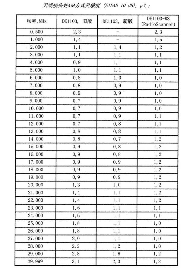 表中开始部分缺乏新版收音机的灵敏度数值是由于调谐低于1710KHz频率时机器自动接通磁棒天线的原因。旧版DE1103的外接天线接头在所有SW波段一直是接通的。