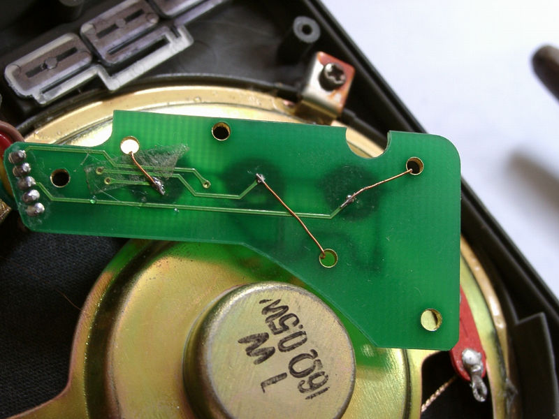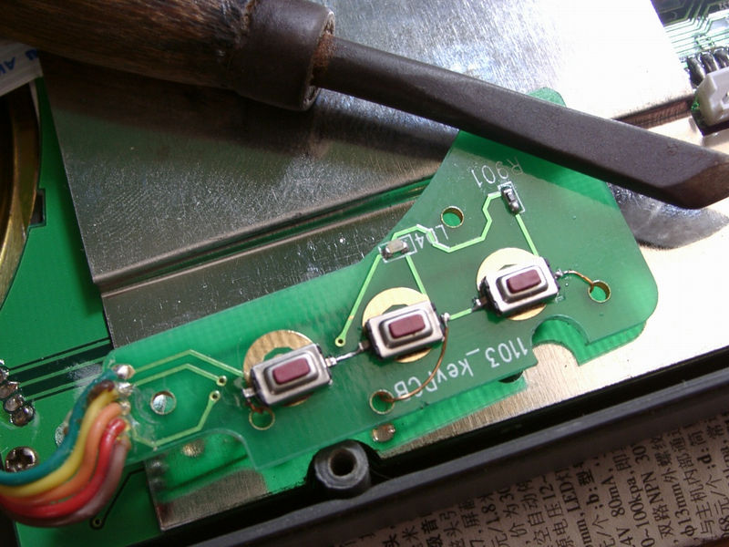 2)在这三个按键的底部粘上双面胶,按键的一端微微翘起一端焊接在PCB的正面.翘起的一端用漆