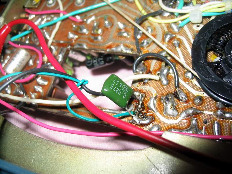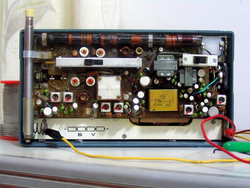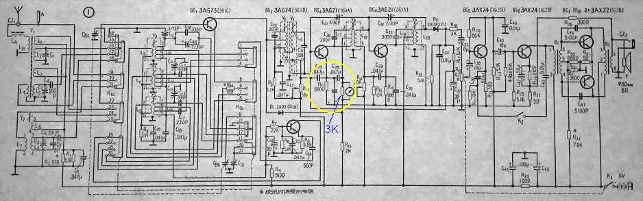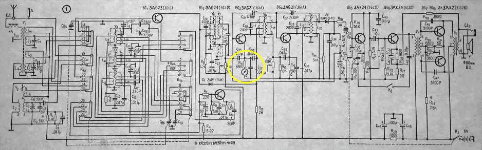 打开B-802-1收音机后盖,卸下电路板,寻找到1中放位置,可以看到其接入电平表的地方通过一根黑色的导线连接到“地”,省去了电平表。