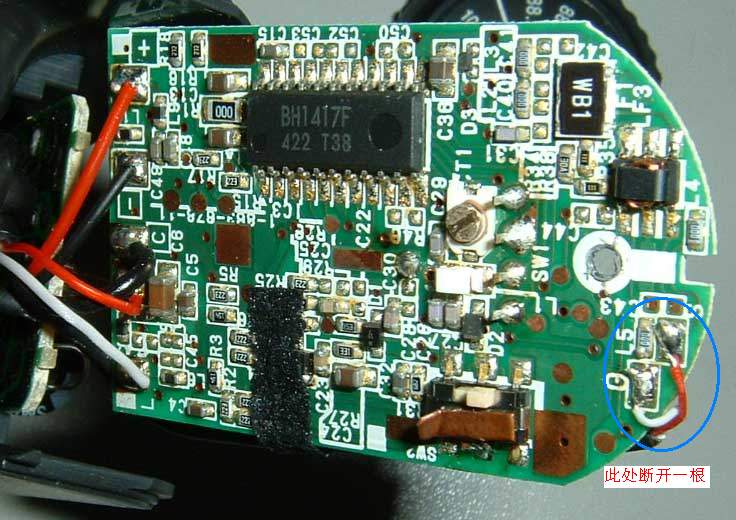先从网上下载了bh1417资料研究,电路板上看bh1417第5角通过电容、62K电阻、两只并联在一起的RC、再接到三极管上。减小62K电阻将会加大调制度深度。