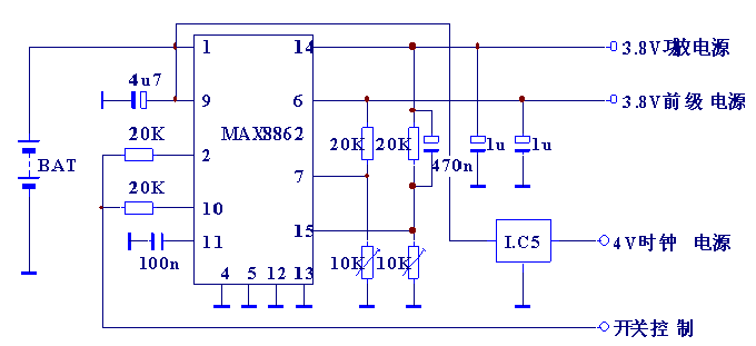 为此我采用了一块微型的双路高效率,低功耗,带启动控制端的新型稳压器MAX8862来替换原机的电源开关,使上述问题得以完美解决,见图<2>电路。
