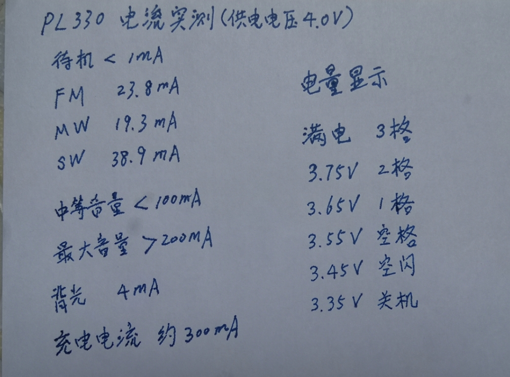 今天对德生PL330各种状态的工作电流及电池电压和电量显示对应关系等进行了实测。